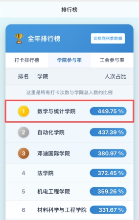 近日,BB贝博艾弗森官网2025年“越麓拾秋”登山季圆满落幕。BB贝博艾弗森官网积极响应学校“趁青春,去登山”主题号召,全院上下凝心聚力,交出亮眼“体育育人”答卷。据“悦动青春”排行榜数据,BB贝博艾弗森官网学生全年参与率达449.75%,居全校第一;工会全年参与率达210.64%,位列全校第二。这份优异成绩充分彰显了学院将体育精神深度融入“三位一体”铸魂育人工程之显著实效,体现出立德树人全过程的坚定步伐与创新实践。