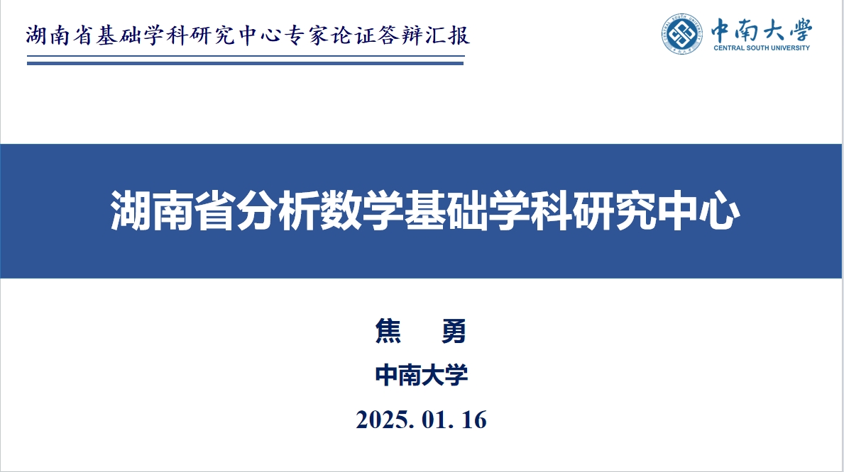 近日,湖南省科学技术厅下达通知,由我院焦勇教授牵头组建的“湖南省分析数学基础学科研究中心”正式获批,是首批获批的湖南省基础学科研究中心之一。自2024年11月湖南省科学技术厅下达《关于开展2024年度湖南省基础学科研究中心定向组建工作的通知》以来,学院高度重视中心组建工作,第一时间把握通知要求,组织团队撰写组建方案,顺利通过了学校推选,并报送湖南省科技厅;今年1月16日,湖南省科技厅领导和多位专家莅临学院进行专家论证和现场考察;3月12日,“湖南省分析数学基础学科研究中心”正式获批。