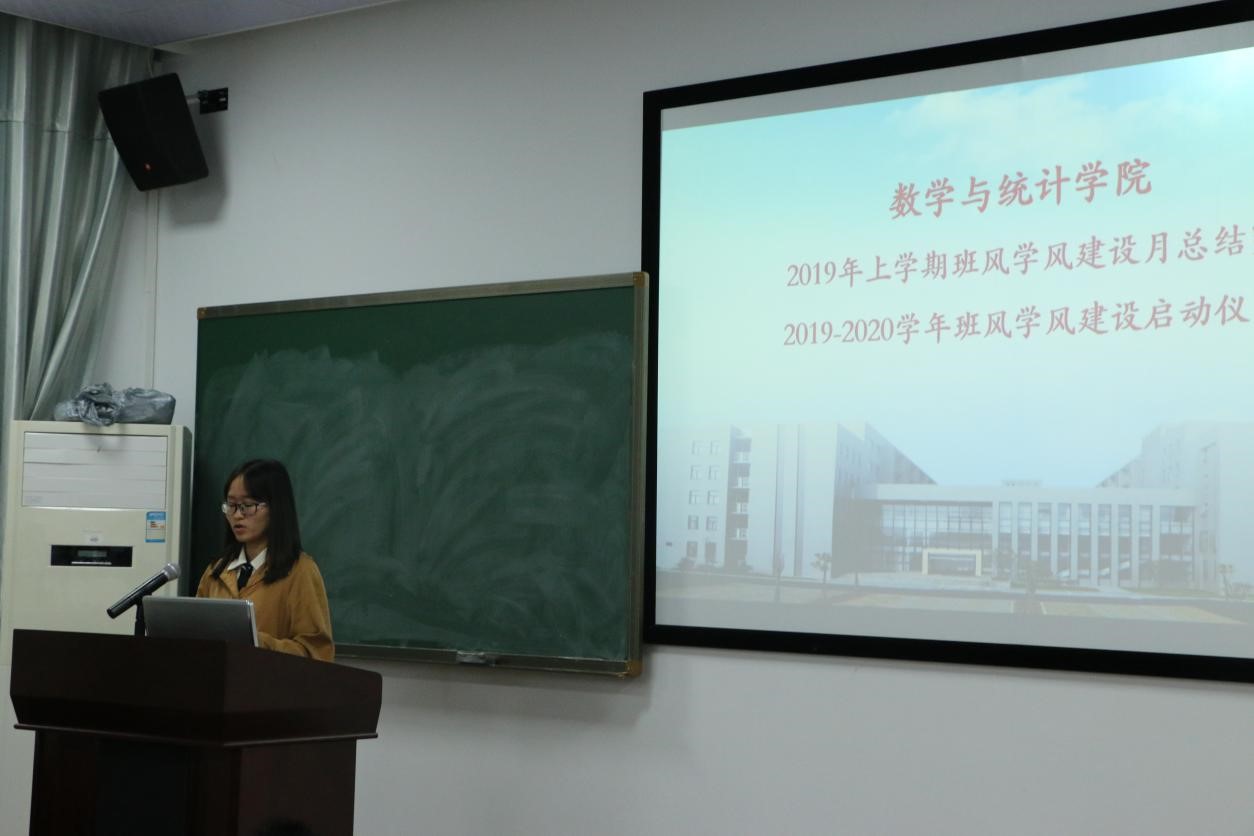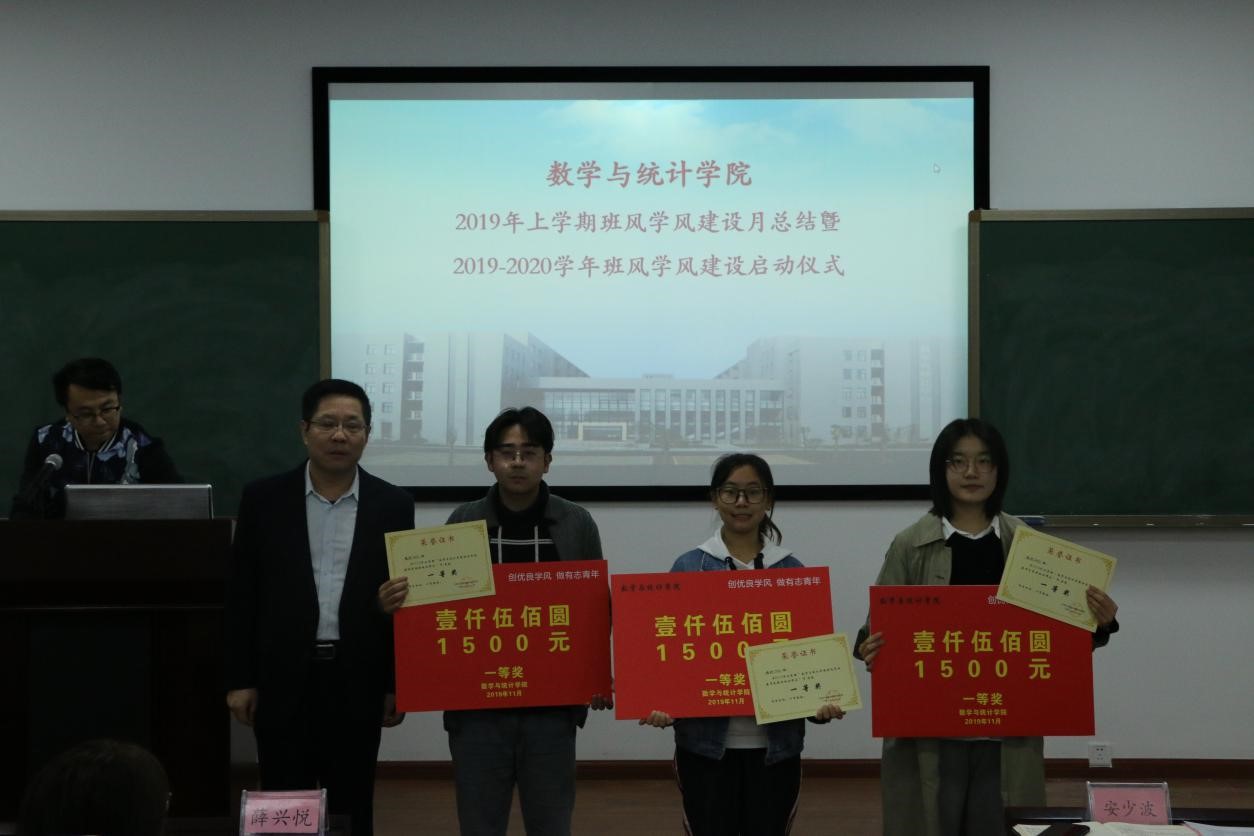 仪式开始,全体起立奏唱国歌。随后,王芬老师宣读《关于表彰2019年上学期BB贝博艾弗森官网班风学风建设先进班级的决定》。王芬老师指出为充分调动学生自觉学习、奋发进取、立志成才的积极性,深入促进优良班风的形成和优良学风的推广,激励同学们更好的开展班级活动、学风建设总结交流学习互助等活动,数统院于2019年上学期开展了班风学风建设月活动,在此次活动中涌现了一批先进班集体,其中统计1602班、统计1702班、统计1802班获一等奖;信科1602班、信科1701班、应数1801班获二等奖;信科1601班、统计1701班、统计1801班获三等奖。王芬老师对获奖班级提出了高度赞扬并希望他们再接再厉,同时也号召各个班级以获奖班级为榜样,努力促进班风学风建设。