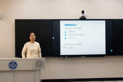 刘圣军、方秋莲、唐美兰、唐立、胡志和陈和柏为负责人的六个团队进行新增项目申报答辩。刘圣军老师畅谈了在课堂思政建设中的案例,引用“差之毫厘,谬以千里”来说明数值计算的误差。方秋莲老师展示了其所做的统计学课程内容体系及德融情况表,以表中的动态数列分析教学内容为例,用不同数据类型数据进行类比等方式教学,告诉学生要增强意识、坚定自信。陈和柏老师以常微分方程中的定义、公式、结论为基础案例,挖掘了其中蕴含的哲学思想,以便于学生弄清知识网络内涵,培养学生的辩证唯物主义观。十位老师逐一汇报,内涵丰富,精彩纷呈。