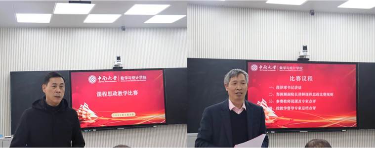 学院党委段泽球书记首先发表讲话,他指出学院高度重视课程思政建设,课程思政教学研究中心认真谋划和组织,学院已连续第三年举办课程思政比赛,参赛人数逐年增加,教师代表覆盖面逐年扩大。举办课程思政比赛不仅为参赛教师提供展示的舞台,也为广大教师创造交流的平台,希望更多教师重视课程思政,推进专业知识传授与思想政治教育同向同行,加快形成“三全育人”工作格局,不断提升教学与人才培养质量,推动学院高质量内涵式发展。郑洲顺副院长宣读比赛规则和评分标准后比赛正式开始。